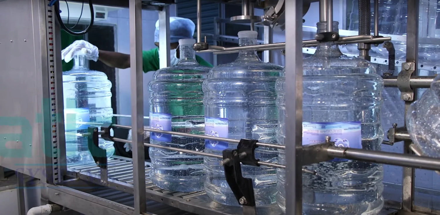 Complete turnkey setup including RO system, ozonation, UV disinfection, and bottling line — meeting BIS standards for packaged drinking water production.