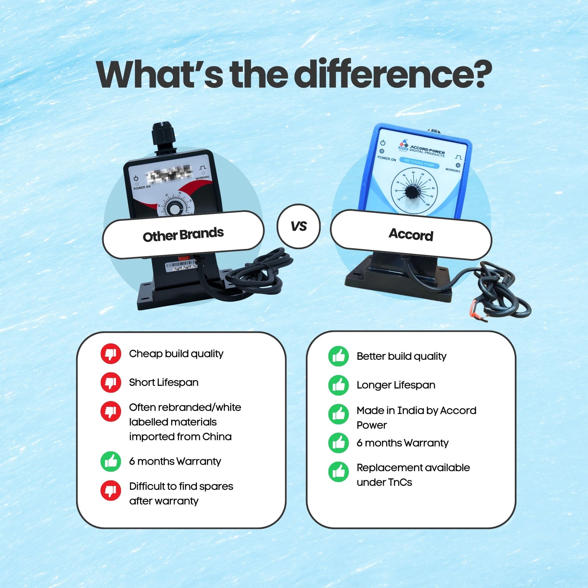 The Accord Power Antiscalant Chemical Dosing Pump is a compact and dependable solution for accurate chemical dosing in RO and water treatment systems. Designed for simple operation and consistent performance, this pump is widely used for antiscalant, chlorine, and other water treatment chemical dosing applications.