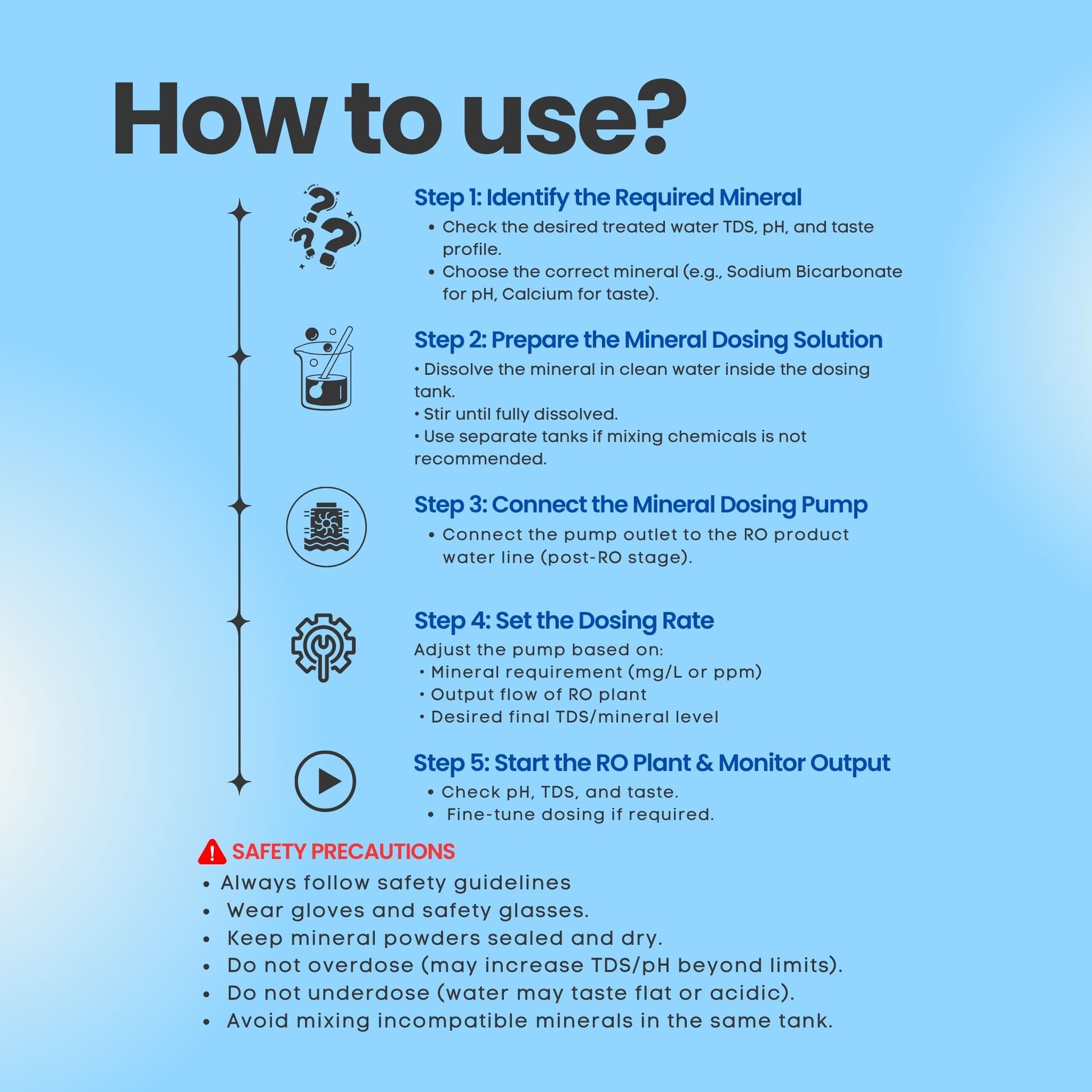 - Typical dosing range: 5–15 ppm, based on taste preference and mineral target