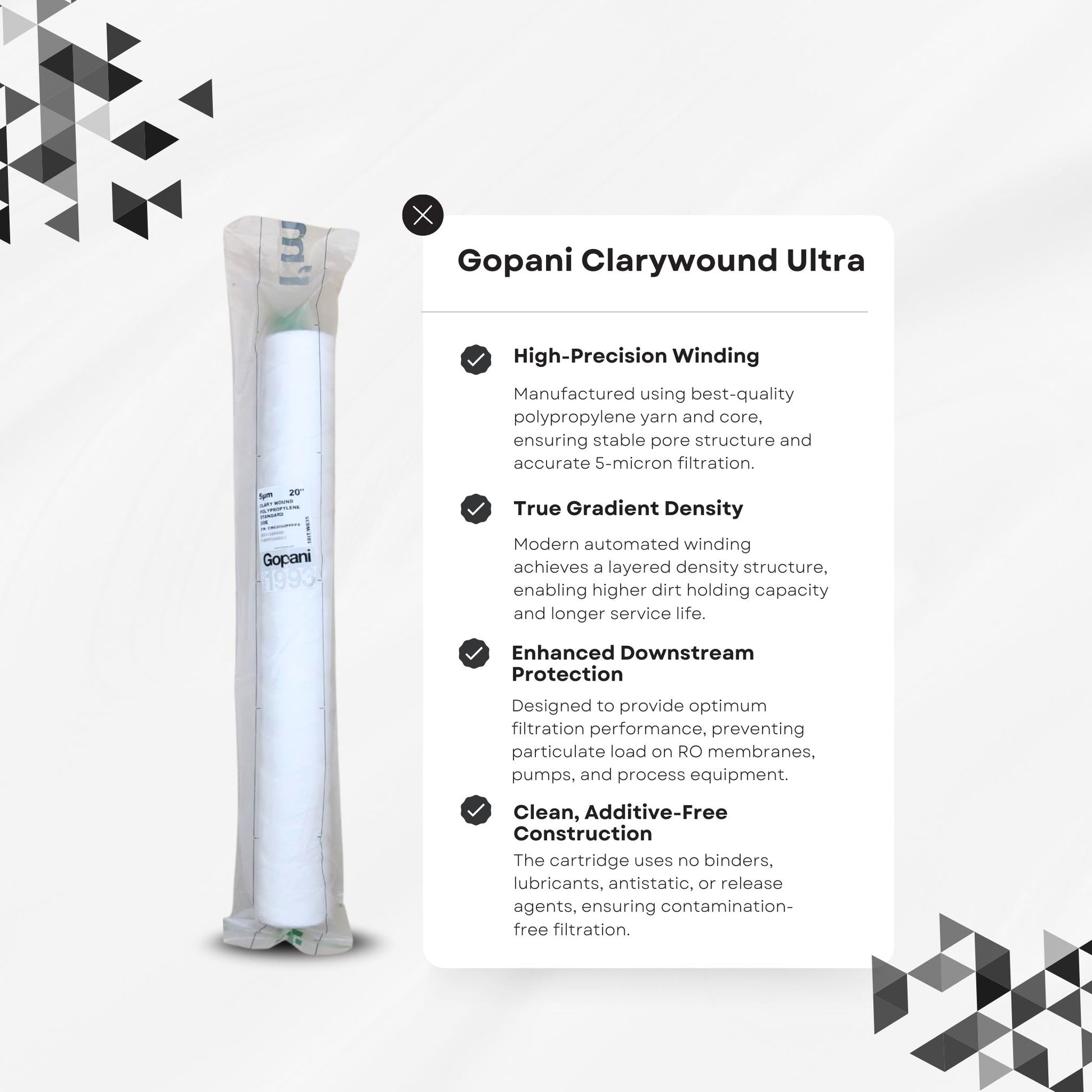 The Gopani Clarywound Ultra 2.5 x 20" String Wound Cartridge is a high-precision, value-for-money sediment filter engineered to deliver strong dirt-holding capacity and reliable filtration. Manufactured using premium polypropylene yarn and core, it provides true gradient density, ensuring efficient removal of sand, silt, rust, and suspended impurities.