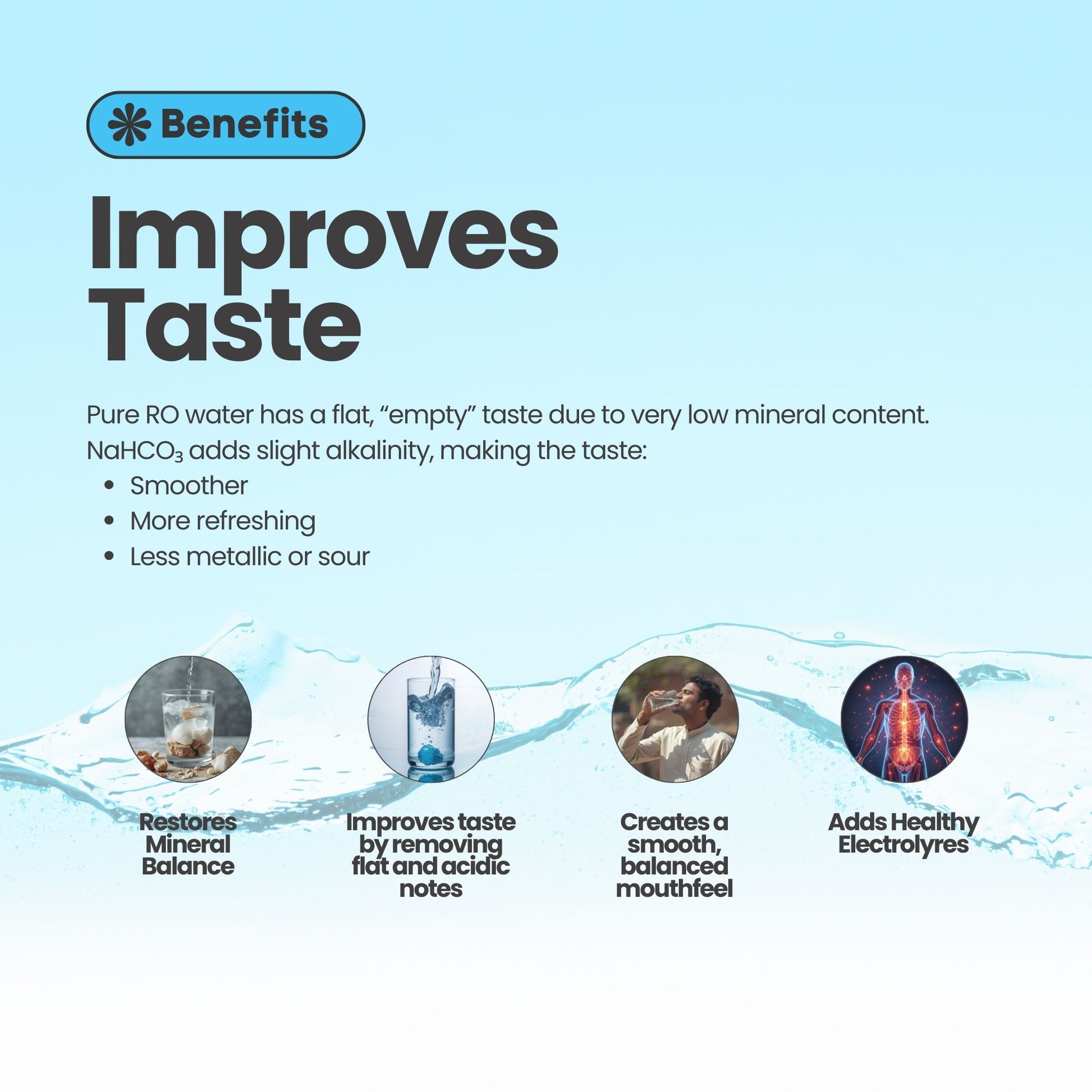 It improves the taste, balance, and stability of RO-treated water, removing flat or slightly acidic characteristics and making the water smoother and more pleasant for drinking.